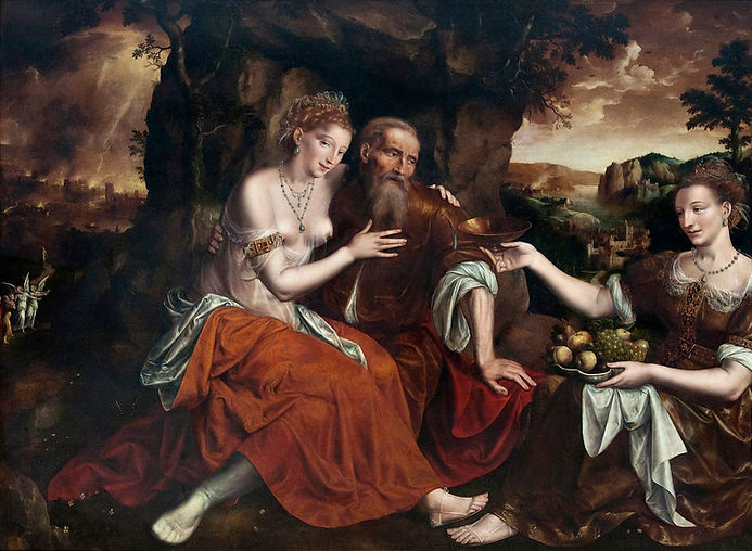 À droite, la seconde fille, également élégamment vêtue mais dans des tons plus sombres, présente à Loth une coupe de vin, élément central de la narration. De l’autre main, elle soutient un panier de fruits ; figues, pommes et raisins, posé sur ses genoux. Son sourire et son regard dirigé vers l’homme âgé participent pleinement à la mise en scène de la séduction… (cliquez sur le bouton à droite pour continuer à lire)